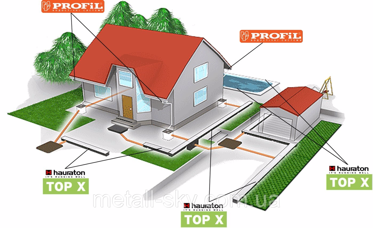 УВАГА ВАЖЛИВО! У жодному разі не спрямовуйте воду з даху в дренаж. Так ви не видалите воду, а навпаки наситите нею ґрунт навколо фундаменту. Перфорація у трубах спрацює у реверсному режимі.
